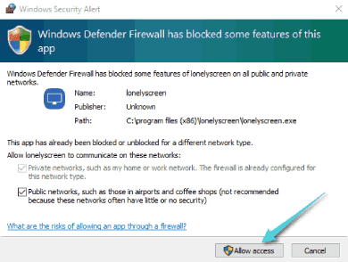 إذا كنت تستخدم جدار الحماية على الويندوز الخاص بك، فقد تتلقى إشعاراً أثناء التثبيت يفيد بأن جدار الحماية قد حظر بعض الميزات. قم بتحديد أنواع الشبكات التي ترغب بأن يتَّصِلَ بها LonelyScreen.