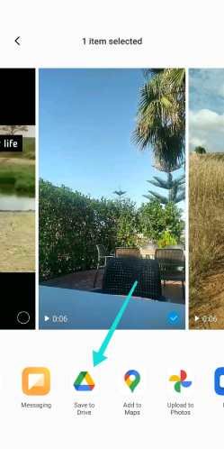 في مثالنا هذا سوف نقوم نستخدم تطبيق Google Drive. لذلك، قم بفتح تطبيق المعرض “Gallery” ثم توجه إلى الفيديو المراد إرساله. بمجرد الدخول إلى الفيديو، انقر على زر مشاركة “Share” (في بعض الهواتف قد تظهر لك أيقونة المشاركة فقط). ضمن قائمة التطبيقات التي ظهرت لك، حدد Google Drive أو خيار حفظ في درايف “Save to Drive”.