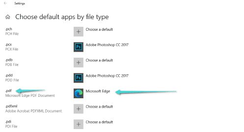 ستظهر لك جميع التطبيقات الافتراضية لجميع أنواع الملفات على ويندوز 10. نحن ما يهمنا هنا هو PDF، ابحث عن .pdf وسوف تجد بجانبه Microsoft Edge كقارئ افتراضي له.