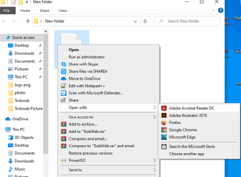 حدد خيار فتح مع “Open With” وسوف تظهر لك خيارات فرعية تشمل البرامج التي يمكنها فتح ملف PDF. يمكنك تحديد أحد البرامج التي تظهر، أو إذا كنت ترغب باختيار قارئ PDF آخر غير موجود ضمن القائمة الفرعية، فانقر على خيار اختيار تطبيق آخر “Choose another app”.