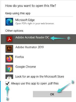 ضمن القائمة التي ظهرت، حدد قارئ PDF الذي تفضله، ثم قم بتمكين استخدام هذا التطبيق دائماً لفتح ملفات .pdf. أخيراً، انقر على زر Ok.