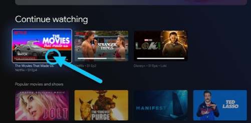 يتم عرض في قسم متابعة المشاهدة جميع الأفلام والبرامج التلفزيونية التي بدأت في مشاهدتها ولم تكملها بعد، وحتى بعد إعادة تشغيل Google TV. لذلك، إذا كنت لا ترغب في مواصلة المشاهدة أو نقرت على فيلم معين عن طريق الصدفة، يمكنك إزالة ذلك من قسم متابعة المشاهدة للحفاظ على خصوصية ما تشاهده.
