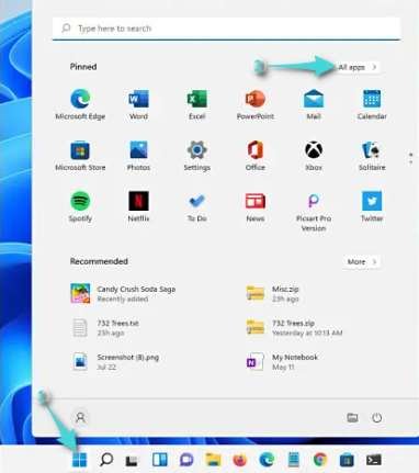 يتيح لك نظام ويندوز 11 طريقة سهلة وسريعة لإلغاء تثبيت البرامج، وهي من خلال قائمة إبدأ. للقيام بذلك، انقر على أيقونة إبدأ “Start”، ثم اضغط على خيار جميع التطبيقات “All Apps” في الزاوية العلوية من القائمة التي ظهرت.