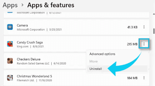مرر للأسفل نحو قسم التطبيقات ثم توجه إلى التطبيق الذي تريد إلغاء تثبيته. تنقر على خيار الثلاث نقاط بجانبه، ثم حدد إلغاء التثبيت “Uninstall” في القائمة التي تظهر.