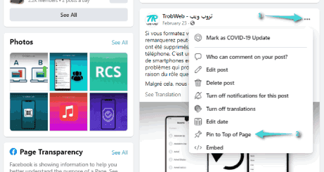 ادخل مباشرة إلى صفحة الفيسبوك ثم توجه إلى المنشور المراد تثبيته في الأعلى. انقر على الثلاث نقاط الموجود بجانب المنشور، ثم حدد خيار تثبيت في أعلى الصفحة “Pin to Top of Page”.