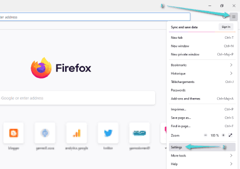 افتح متصفح Mozilla Firefox على جهازك الكمبيوتر سواء كان ماك، ويندوز، أو لينكس. بعد ذلك، انقر على خيار الثلاث أشرطة الموجودة في الزاوية العلوية من واجهة المتصفح. من القائمة الجانبية التي ظهرت، حدد الإعدادات “Settings”.