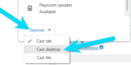 ضمن القائمة المنبثقة، انقر على القائمة المنسدلة “المصادر”، ثم حدد خيار إرسال سطح المكتب “Cast Desktop”.