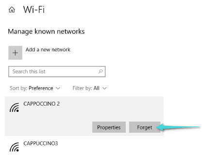 - اختر شبكة الواي فاي التي تواجه المشكبة فيها، ثم اضغط على نِسيان “Forget”.