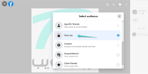 سوف تظهر نافذة لتحديد من سيتمكن من رؤية تلك الصورة. إذا أدرت إخفاءها عن الكل، ما عليك سوى تحديد خيار أنا فقط “Only me”. سوف تجد خيارات أخرى، مثل جعل الصورة مرئية للأصدقاء فقط، أو الأصدقاء باستثناء البعض الذين يمكنك تحديدهم، أيظاً يمكنك إظهار الصورة فقط للأصدقاء المقربين، وغيرها من الخيارات الأخرى.
