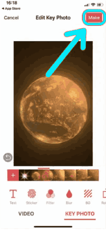 بمجرد تحديد الفيديو، يمكنك قصُّه وإجراء تعديلات عليه إذا أدرت مثل إضافة نص، التحكم في سرعة الفيديو، الحجم، إضافة فلتر، وغيرها. بعد ذلك، انقر على زر جعل “Make” في الجانب العلوي.