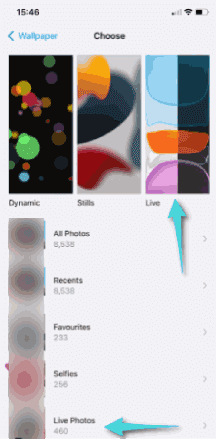بناءاً على رغبتك، يمكنك النقر على خيار حية “Live” في الجزء العلوي لتعيين أحد الخلفيات الحية الافتراضية التي تأتي مضمنة في الايفون. بدلاً من ذلك، إذا قمت بتحويل فيديو إلى خلفية حية مسبقاً، فسوف تجده ضمن قسم الصور الحية “Live Photos” أو أي قسم آخر وضع فيه الصورة الحية.