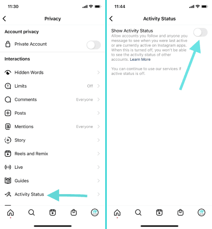 اضغط على خيار حالة النشاط “Activity Status” في الأسفل، ثم قم بتعطيل الزر الموجود بجانب خيار إظهار حالة النشاط “Show Activity Status”.