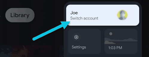 بعد تشغيل Google TV، على الشاشة الرئيسية انقر على الصورة المصغرة للبروفايل الخاص بك الموجودة في الجانب العلوي. من القائمة التي ظهرت، حدد حسابك كما هو مبين في الصورة أسفله.